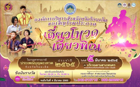ประกาศองค์การบริหารส่วนจังหวัดร้อยเอ็ด เรื่อง หลักเกณฑ์การประกวดเดี่ยวโหวดและเดี่ยวพิณในงานมหาทานบารมีประเพณีบุญผะเหวดจังหวัดร้อยเอ็ด ประจำปี 2565 รายละเอียด https://drive.google.com/file/d/1shmm8el2nC9ybgalfuEgLIaGuY2HROe-/view