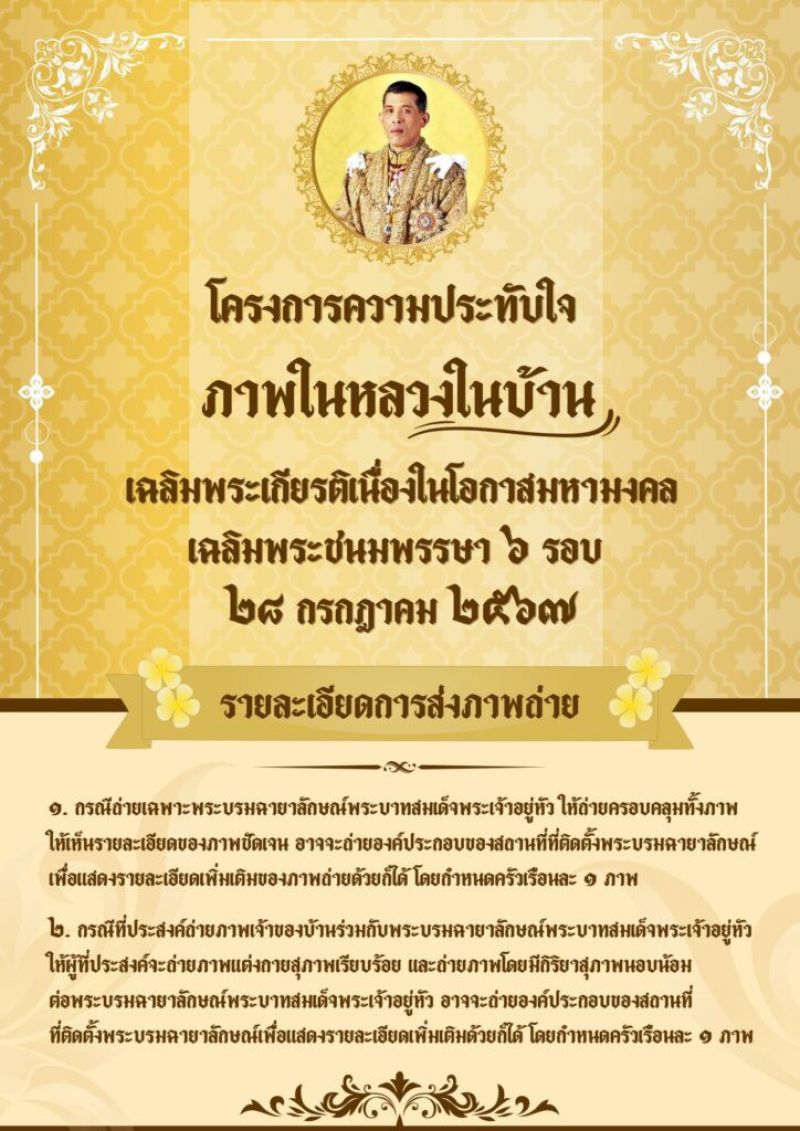 องค์การบริหารส่วนจังหวัดร้อยเอ็ดขอประชาสัมพันธ์โครงการความประทับใจภาพในหลวงในบ้านเพื่อเป็นช่องทางให้ประชาชนได้มีส่วนร่วมในการเเสดงออกถึงความจงรักภักดีต่อสถาบันพระมหากษัตริย์โดยการส่งภาพถ่ายพระบรมฉายาลักษณ์พระบาทสมเด็จพระเจ้าอยู่หัวที่ประดับไว้ณบ้านเรือนของตัวเองเพื่อรวบรวมทำเป็นสมุดภาพออนไลน์E-Bookระดับจังหวัดเเละระดับประเทศเเละเป็นการเฉลิมพระเกียรติพระบาทสมเด็จพระเจ้าอยู่หัวเนื่องในโอกาสมหามงคลเฉลิมพระชนมพรรษา6รอบ28กรกฎาคม2567