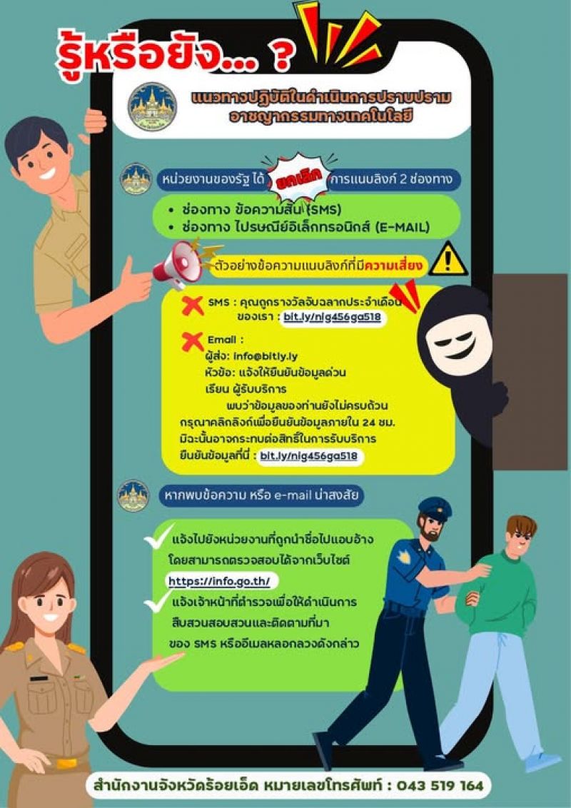 เตือนภัย! อาชญากรรมออนไลน์ใกล้ตัวกว่าที่คิด มิจฉาชีพมักแอบอ้างเป็นหน่วยงานรัฐ ส่ง SMS หรือ E-mail แนบลิงก์หลอกให้ยืนยันข้อมูล หรือแจ้งว่าถูกรางวัล อย่าคลิกลิงก์แปลก ๆ อย่าให้ข้อมูลส่วนตัว อย่าหลงเชื่อข้อความเร่งด่วน หน่วยงานรัฐ ไม่ขอข้อมูลผ่านลิงก์ ตรวจสอบรายชื่อหน่วยงานได้ที่ www.info.go.th เก็บหลักฐาน และแจ้งตำรวจทันที รู้ทัน ไม่คลิก ไม่โอน ปลอดภัยจากภัยออนไลน์